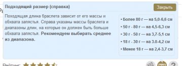 Походящая длина браслета зависит от его массы и обхвата запястья. Справа указаны массы браслета и диапазоны длин, на которые он должен быть больше обхвата запястья.																							- Более 80 г — на 5,0-6,6 см